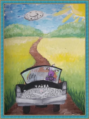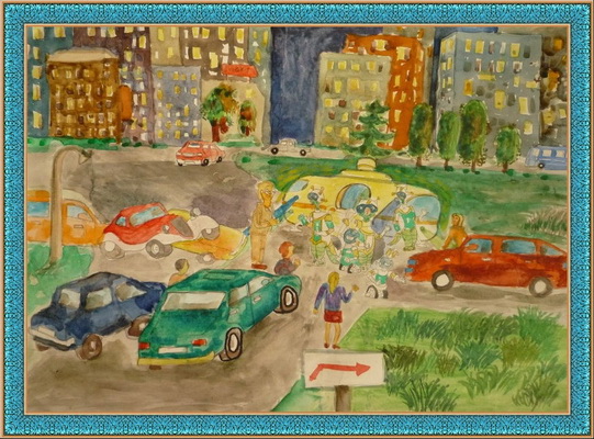 Третье место -ДТП из-за инопланетян Каршибаев Иляс, педагог Шеньшина Оксана Анатольевна. Детская художественная школа, г. Гай