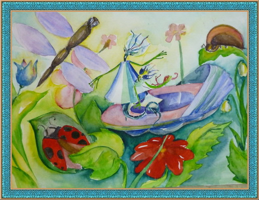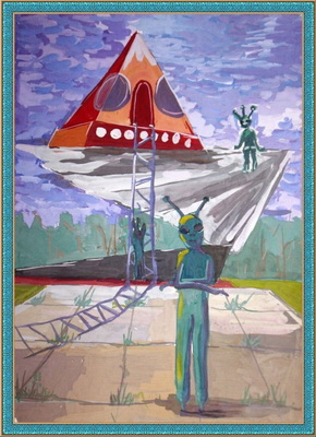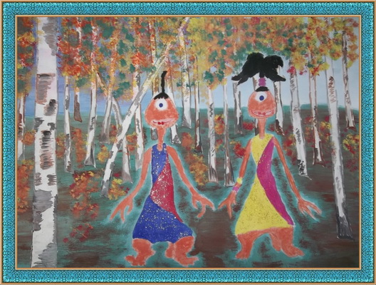 Победитель -Инопланетяне на лесной опушке, собирают грибы Шингер Дарья, педагог Литвинова Ирина Александровна. Детская художественная школа им. Н.В.Овечкина, Ростовская область, г. Новошахтинск