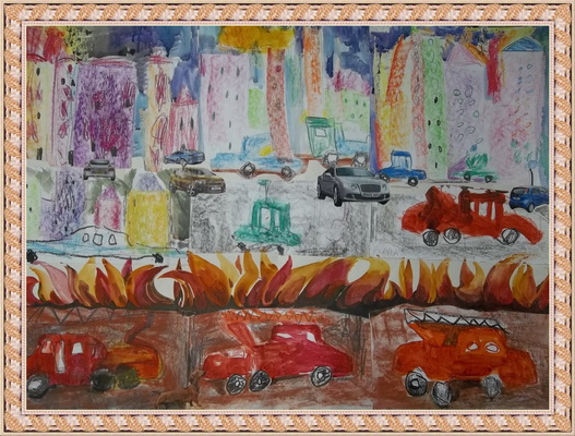 Третье место -Пожар в городе Коллективная работа, педагог Королёва Ирина Ивановна. Развивающий детский центр "Мир детства", г. Балашиха