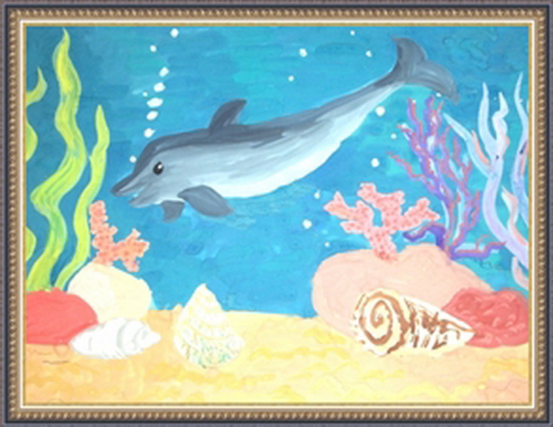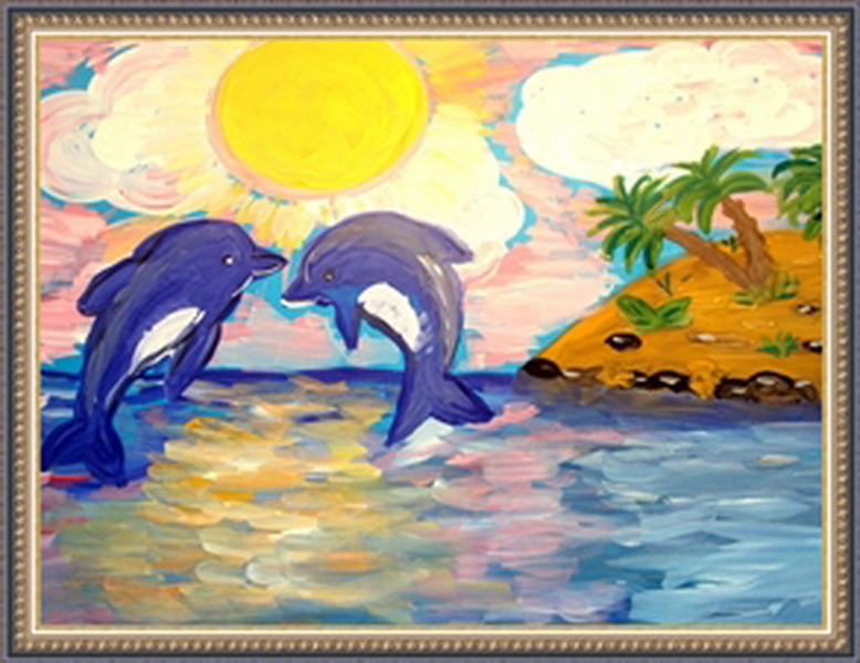 Третье место -Девочка и дельфины Рогова Ксения, Детская художественная школа №4 им. П.И.Котова, Астраханская область, п. Верхний Баскунчак