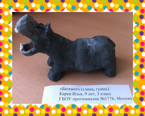 Второе место -Бегемот Карев Илья, педагог Кулешова Ольга Ивановна. Прогимназия №1776, г.Москва