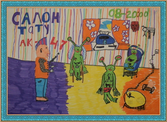Третье место -Инопланетяне в тату - салоне Полтавцев Денис, педагог Ветошкина Виктория Борисовна. Детская школа искусств, п. Таврическое