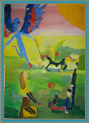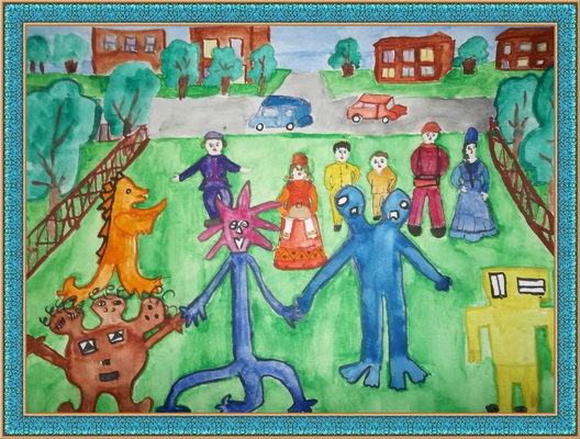 Победитель -Инопланетянин прогуливает дракона, дети прогуливают собачку Шимолина Настя, педагог Смирнова Елена Петровна. Детская школа искусств №2, г. Жигулевск