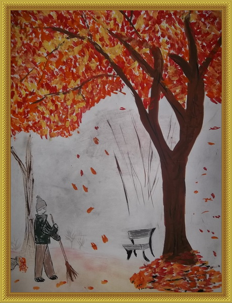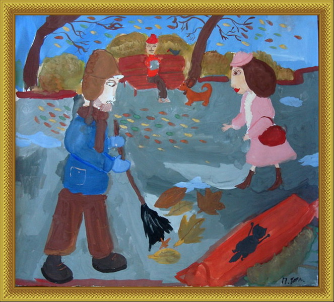 Второе место -Дворник, дама, листопад Пущина Теа, педагог Зеленцова Ольга Александровна. Художественная школа, р-н Протвино